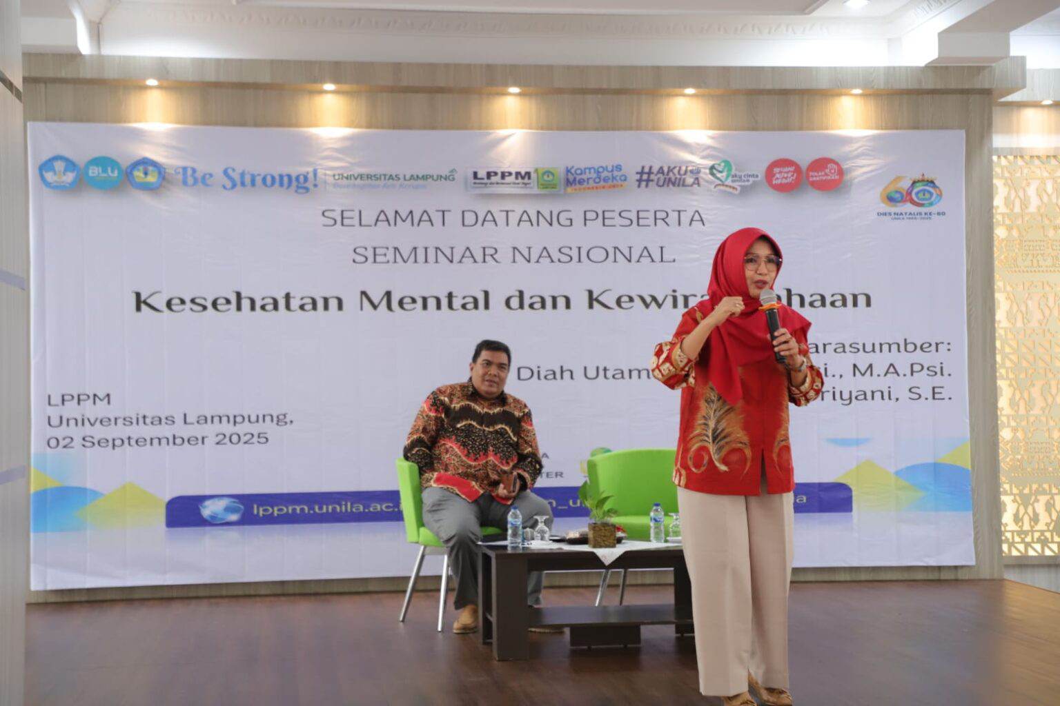 MATAMATA.ID – Rektor Universitas Lampung (Unila), Prof. Dr. Ir. Lusmeilia Afriani, D.E.A., IPM., membuka seminar nasional dengan tema “Kesehatan Mental dan Kewirausahaan” bersama Ikatan Keluarga Purnabakti Unila (IKPA) dalam rangka Hari Ulang Tahun (HUT) IKPA ke-7 pada 2 September 2025, di Perpustakaan Fakultas Ekonomi dan Bisnis (FEB) Unila.
