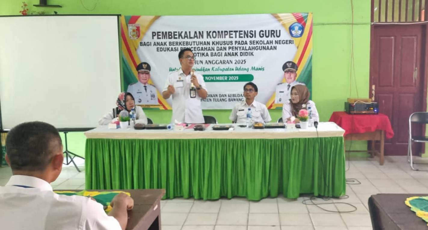 MATAMATA.ID – Pelaksana Tugas (Plt) Kepala Dinas Pendidikan dan Kebudayaan Kabupaten Tulang Bawang, M. Ami Iswandi Ismed Balaw, resmi membuka kegiatan Pembekalan Kompetensi Guru bagi Anak Berkebutuhan Khusus (ABK) yang dilaksanakan untuk sekolah negeri di wilayah setempat. Kegiatan ini turut dirangkaikan dengan edukasi Pencegahan, Pemberantasan, Penyalahgunaan dan Peredaran Gelap Narkotika (P4GN) dengan menghadirkan narasumber dari BNN Provinsi Lampung.
