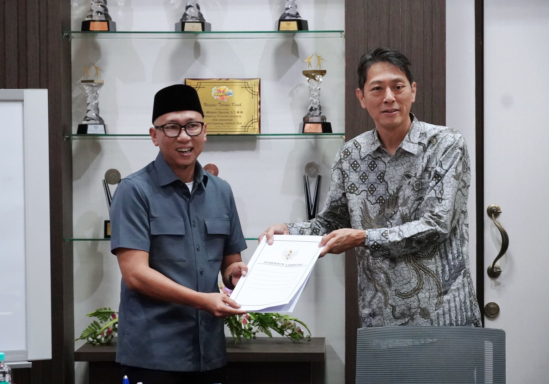 MATAMATA.ID – Gubernur Lampung, Rahmat Mirzani Djausal menerima Senior Executive Director Japan Association for Construction (JAC) Yugo Okamoto dalam pertemuan resmi di ruang kerjanya, Kamis, 4 Desember 2025, untuk membahas penyiapan tenaga kerja Lampung yang berminat bekerja di Jepang.
