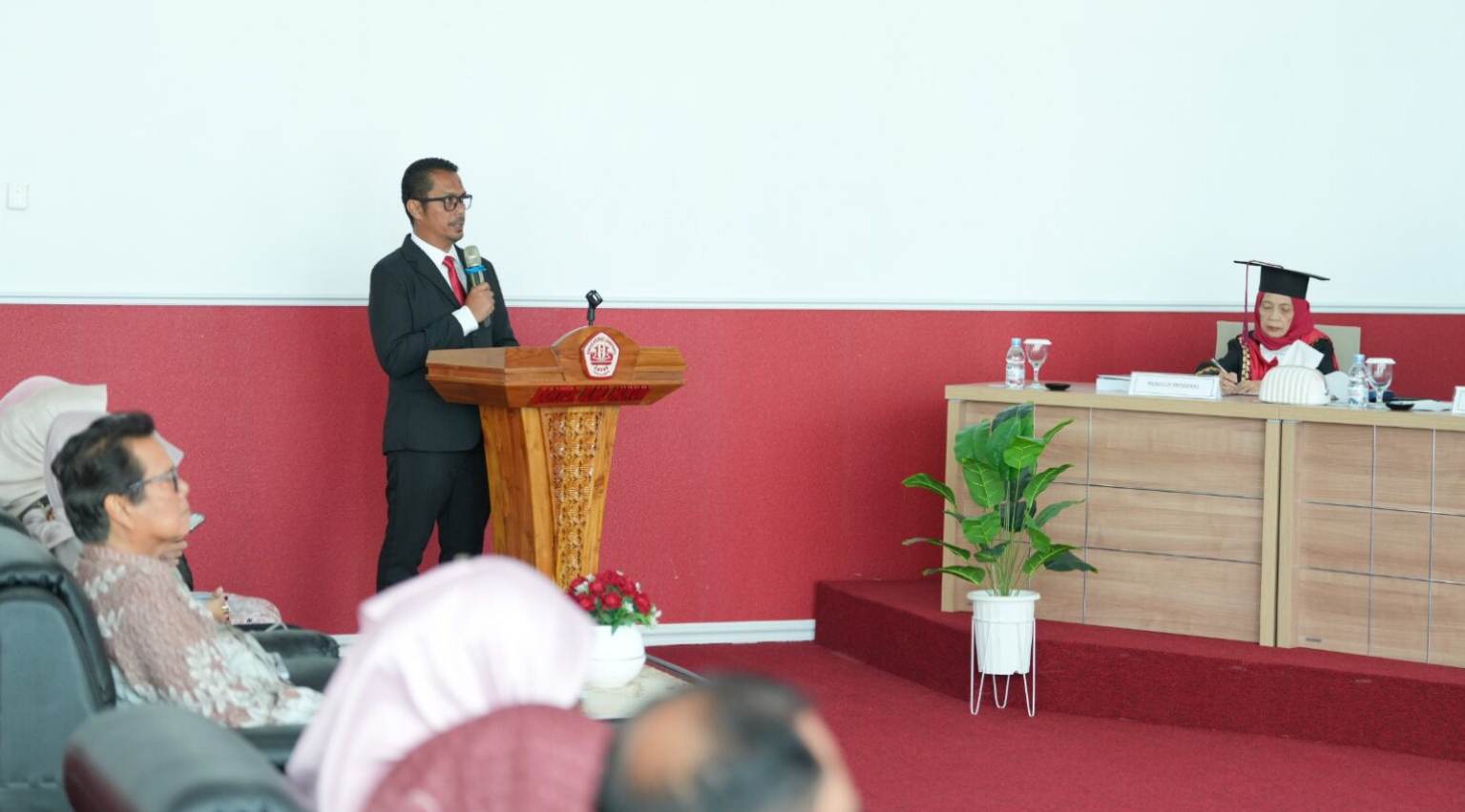 Turut hadir para penguji lainnya, yakni Wakil Dekan Bidang Akademik dan Kerja Sama FH Unila Dr. Ahmad Irzal Fardiansyah, S.H., M.H., Promotor Prof. Dr. Nikmah Rosidah, S.H., M.H., serta Co-Promotor Prof. Dr. Elwi Danil, S.H., M.H.