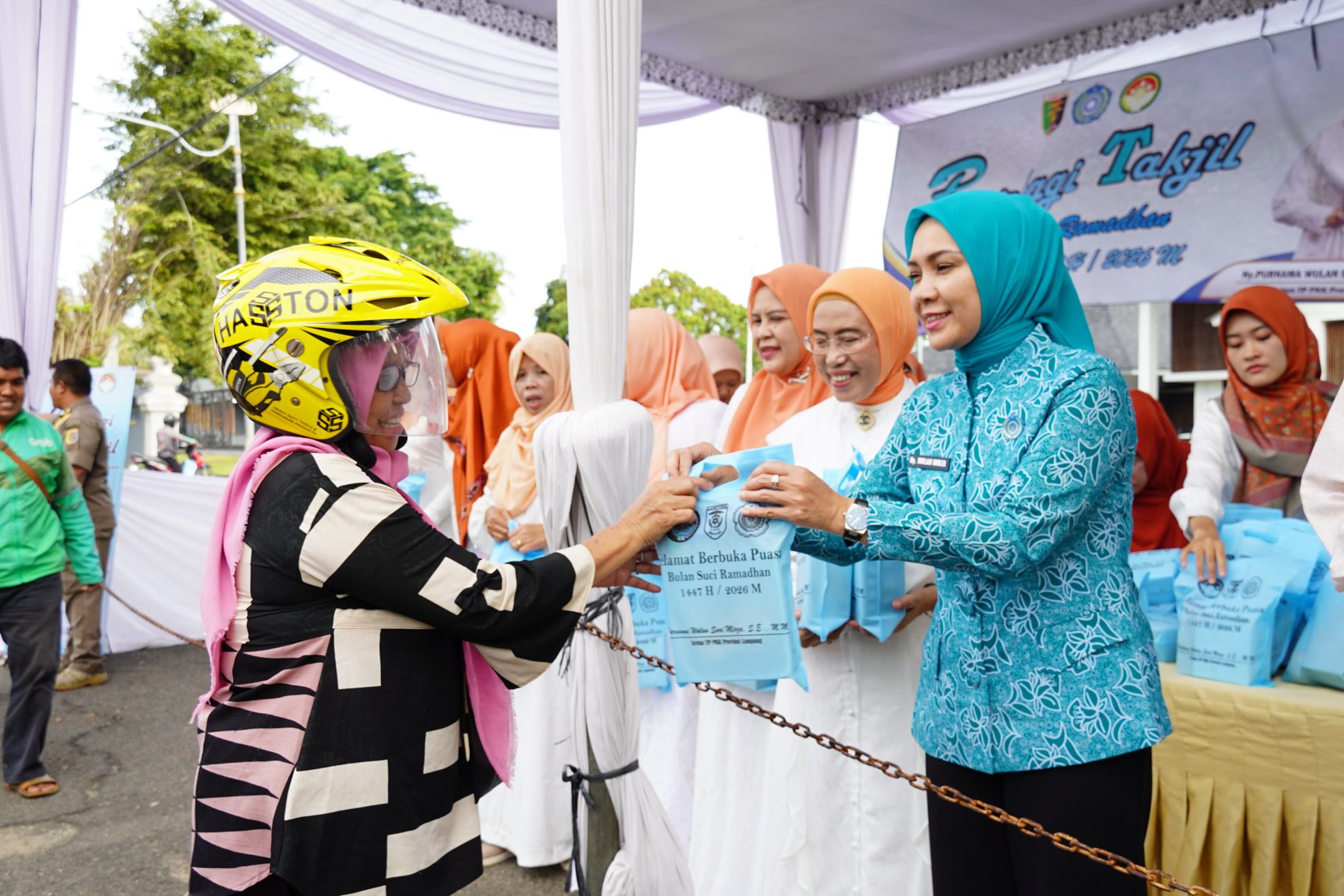 MATAMATA.ID – Tim Penggerak PKK Provinsi Lampung bersama Dharma Wanita Persatuan (DWP) Provinsi Lampung kembali membagikan paket berbuka puasa kepada masyarakat di depan Mahan Agung, Kamis, 26 Februari 2026.
