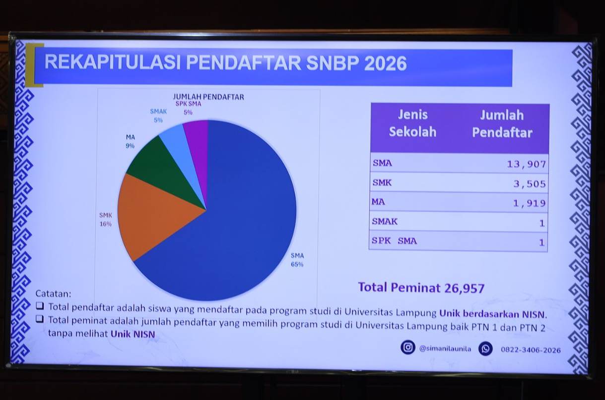 Di sisi lain, tingginya minat masuk Unila tetap menjadi tantangan tersendiri. Dengan total 26.957 pendaftar dan hanya 2.866 yang diterima, peluang lolos melalui jalur SNBP masih sangat terbatas.